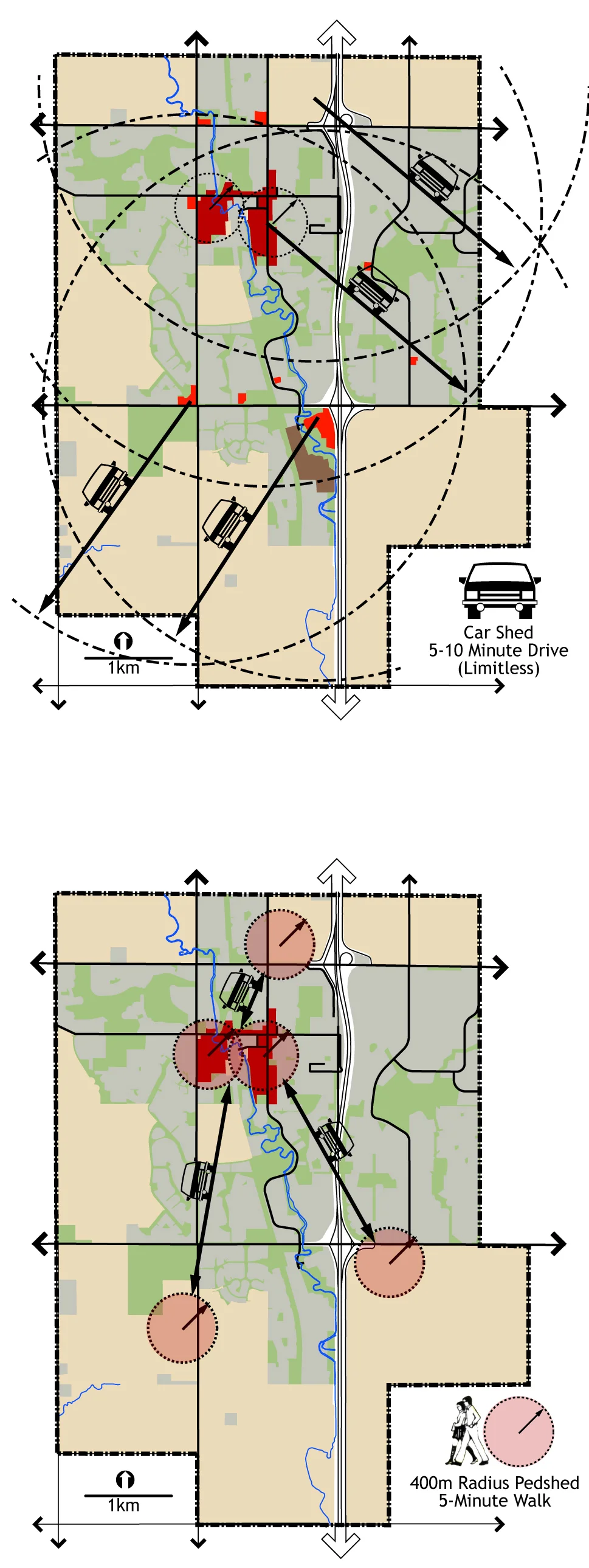 Mixed Use Centers in Airdrie Context: The "Car Shed" versus the "Walk Shed". Drawn by G. Dyer